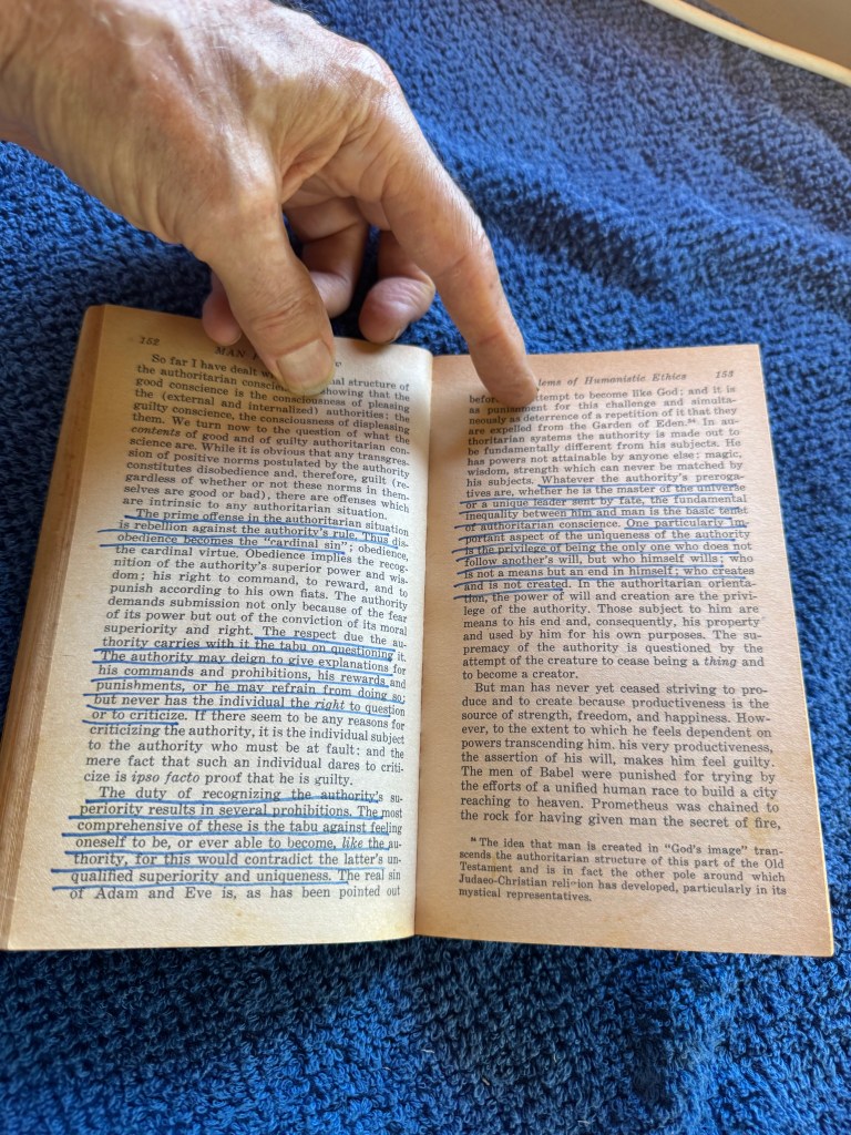 Foi nessa época que uma senhora visitou a sessão de livros usados para vender obras da biblioteca do seu falecido marido. Entre elas havia uma publicação de Erich Fromm intitulada: Man for Himself: an inquiry into the psychology of ethics. Nos anos 1980 eu estudei na Universidade da Carolina do Norte e visitava sebos, livrarias e lojas de discos da cidade. Hoje eu entendo que era um ato de sobrevivência para um jovem submetido às agruras de um programa de doutorado massacrante.