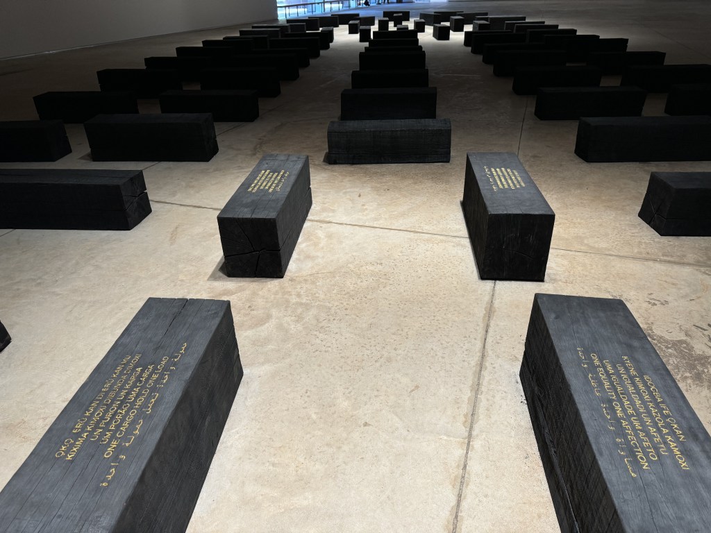 Da obra de Kilomba, as sensações emergiram das palavras, dos volumes carbonizados espalhados pelo piso. Lembro ter ouvido sons, mas não registrei algum elemento que os identificasse. Um navio é delimitado por caixas pretas, volumes cúbicos espalhados pelo chão a lembrar uma nave negreira. Caixões com nomes de pessoas perdidas para a vida. Madeira carbonizada a lembrar o fim de cada um, nas cinzas que serão reincorporadas ao ambiente. O ciclo recompõe átomos e moléculas. Esse conjunto define um corpo, que vive, morre e torna a se decompor. Nomes de histórias perdidas nos porões negreiros, histórias nunca reveladas de desterro. Seres feridos de morte que insistem em sobreviver. Dor e resistência compartilhadas com observadores desconhecidos, séculos depois, em local seguro.